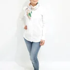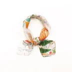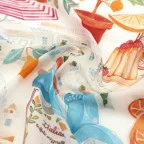 65cm×65cmの小判スカーフで、アスコットタイのようにシャツやブラウスの中におさめて使うこともできます。室内でも巻いたままでいられるので使いやすくなっています。