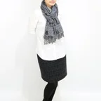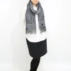 スタンダードな大判サイズで、首に巻くことはもちろん、室内でのひざ掛けにも、肩から羽織る使い方もできます。特に羽織りは、パッと華やかにエレガントな雰囲気に変わります。上半身を覆えるので、着ている服を気にせず合わせることができます。忙しい朝もコーディネートを気にする必要はありません。