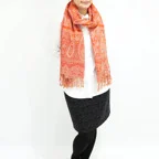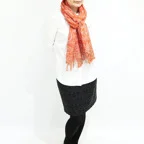 スタンダードな大判サイズで、首に巻くことはもちろん、室内でのひざ掛けにも、肩から羽織る使い方もできます。特に羽織りは、パッと華やかにエレガントな雰囲気に変わります。上半身を覆えるので、着ている服を気にせず合わせることができます。忙しい朝もコーディネートを気にする必要はありません。