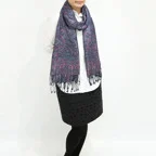 スタンダートな大判サイズで巻いても羽織っても、どちらも使いやすいタイプです。特に羽織は全体の印象がパッと華やかに、エレガントな雰囲気に変化します。