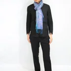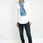 スタンダートな大判サイズで巻いても羽織っても、どちらも使いやすいタイプです。特に羽織は全体の印象がパッと華やかに、エレガントな雰囲気に変化します。