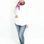 65cm×65cmの小判スカーフで、アスコットタイのようにシャツやブラウスの中におさめて使うこともできます。室内でも巻いたままでいられるので使いやすくなっています。