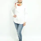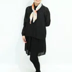 65cm×65cmの小判スカーフで、アスコットタイのようにシャツやブラウスの中におさめて使うこともできます。室内でも巻いたままでいられるので使いやすくなっています。