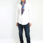 88cm×88cmの大判スカーフで、首元のアクセントに最適。アスコットタイのようにシャツやブラウスの中におさめて使うこともできますし、対角で畳んで肩から羽織ることもできます。また、身につけるだけでなく、手持ちのバッグにキュッと結べるアクセサリーとしても重宝します。