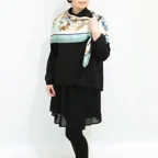 首元をお洒落に魅せる大判スカーフ。イタリアシルクのやさしい肌触りも大きな魅力です。