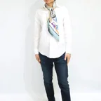 首元をお洒落に魅せる大判スカーフ。イタリアシルクのやさしい肌触りも大きな魅力です。