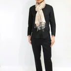 スタンダートな大判サイズで巻いても羽織っても、どちらも使いやすいタイプです。特に羽織は全体の印象がパッと華やかに、エレガントな雰囲気に変化します。