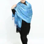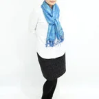 スタンダートな大判サイズで巻いても羽織っても、どちらも使いやすいタイプです。特に羽織は全体の印象がパッと華やかに、エレガントな雰囲気に変化します。