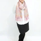スタンダートな大判サイズで巻いても羽織っても、どちらも使いやすいタイプです。特に羽織は全体の印象がパッと華やかに、エレガントな雰囲気に変化します。