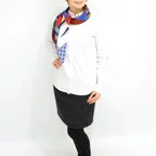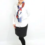 スクエアサイズで、アスコットタイのようにシャツやブラウスの中におさめて使うこともできます。室内でも巻いたままでいられるので使いやすくなっています。