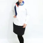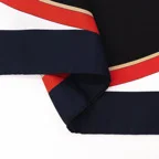 色彩とラインが織りなす、デザイン性の高い一枚。多色使いで合わせやすく、首元のアクセントに最適です。