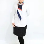 スクエアサイズで、アスコットタイのようにシャツやブラウスの中におさめて使うこともできます。室内でも巻いたままでいられるので使いやすくなっています。