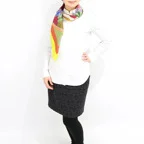 スクエアサイズで、アスコットタイのようにシャツやブラウスの中におさめて使うこともできます。室内でも巻いたままでいられるので使いやすくなっています。