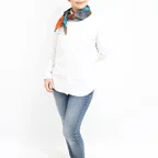 65cm×65cmの小判スカーフで、アスコットタイのようにシャツやブラウスの中におさめて使うこともできます。室内でも巻いたままでいられるので使いやすくなっています。