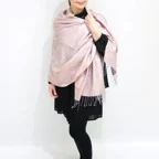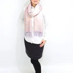 スタンダートな大判サイズで巻いても羽織っても、どちらも使いやすいタイプです。特に羽織は全体の印象がパッと華やかに、エレガントな雰囲気に変化します。
