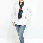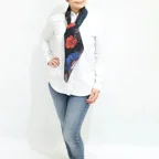 88cm×88cmの大判スカーフで、首元のアクセントに最適。アスコットタイのようにシャツやブラウスの中におさめて使うこともできますし、対角で畳んで肩から羽織ることもできます。また、身につけるだけでなく、手持ちのバッグにキュッと結べるアクセサリーとしても重宝します。