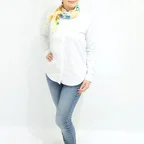 65cm×65cmの小判スカーフで、アスコットタイのようにシャツやブラウスの中におさめて使うこともできます。室内でも巻いたままでいられるので使いやすくなっています。