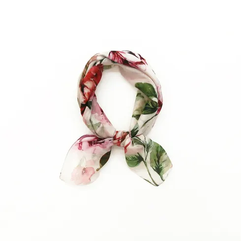小ぶりなスクエアサイズで、アスコットタイのようにシャツやブラウスの中におさめて使うこともできます。室内でも巻いたままでいられるので使いやすくなっています。