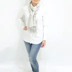 スタンダートな大判サイズで巻いても羽織っても、どちらも使いやすいタイプです。特に羽織は全体の印象がパッと華やかに、エレガントな雰囲気に変化します。