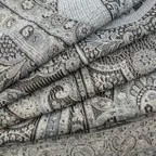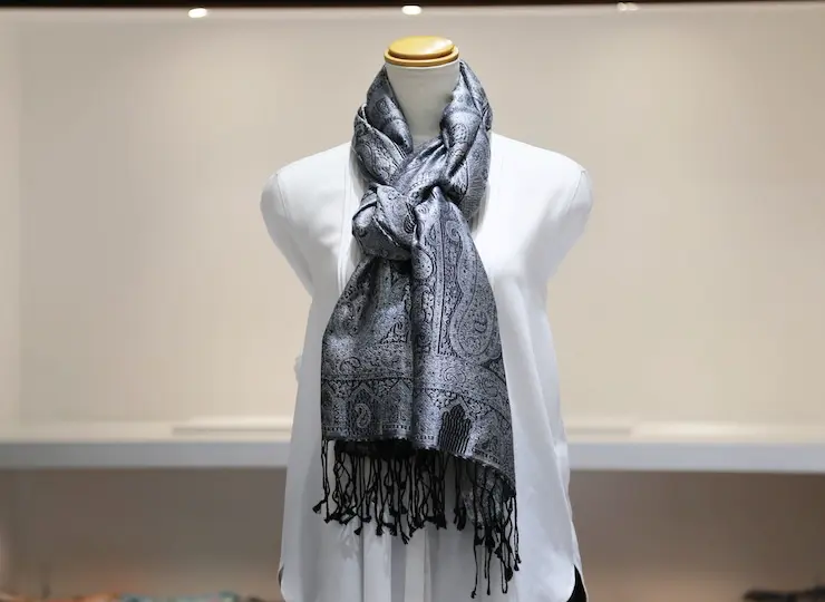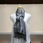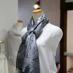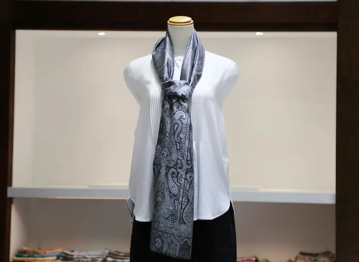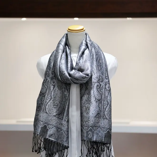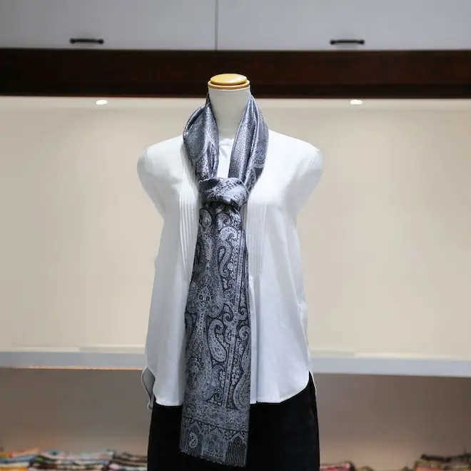 シルク100%のブラック&シルバーグレイの色糸で織り込まれた美しい色使い。合わせやすさとアクセント効果のバランスも絶妙でシックかつ上品な印象になります。