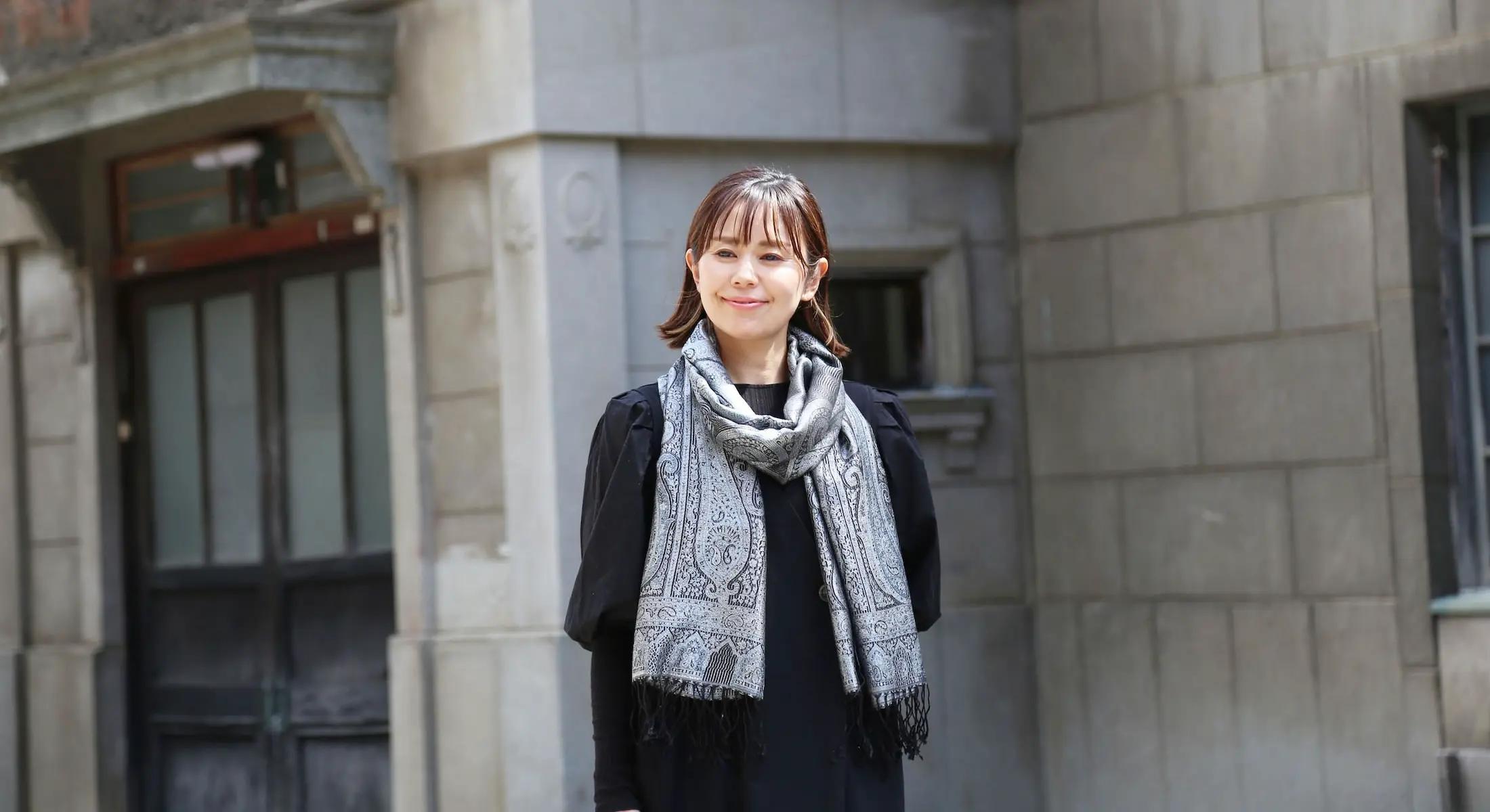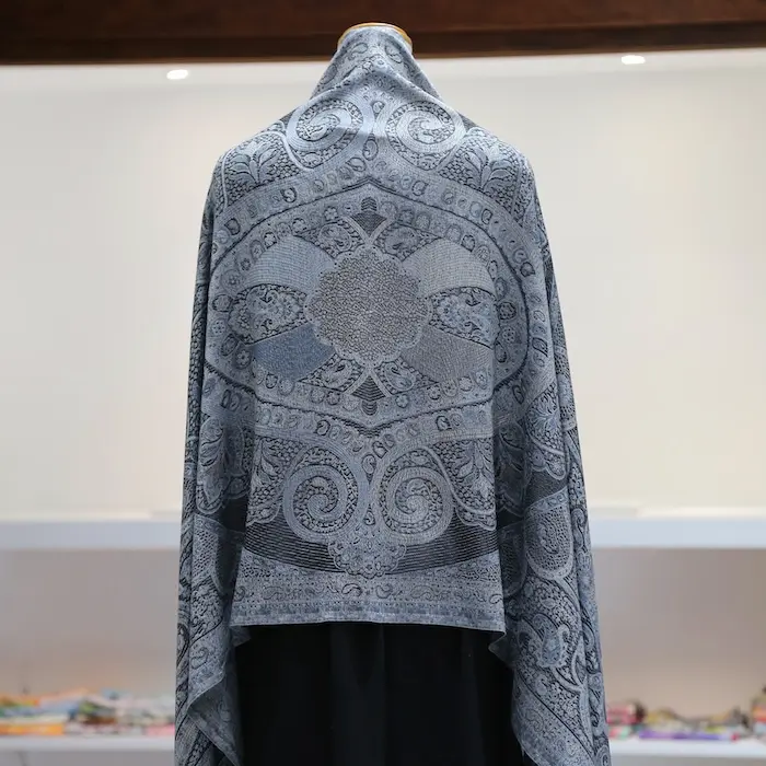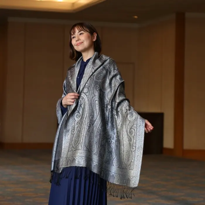 スタンダートな大判サイズで巻いても羽織っても、どちらも使いやすいタイプです。特に羽織は全体の印象がパッと華やかに、エレガントな雰囲気に変化します。