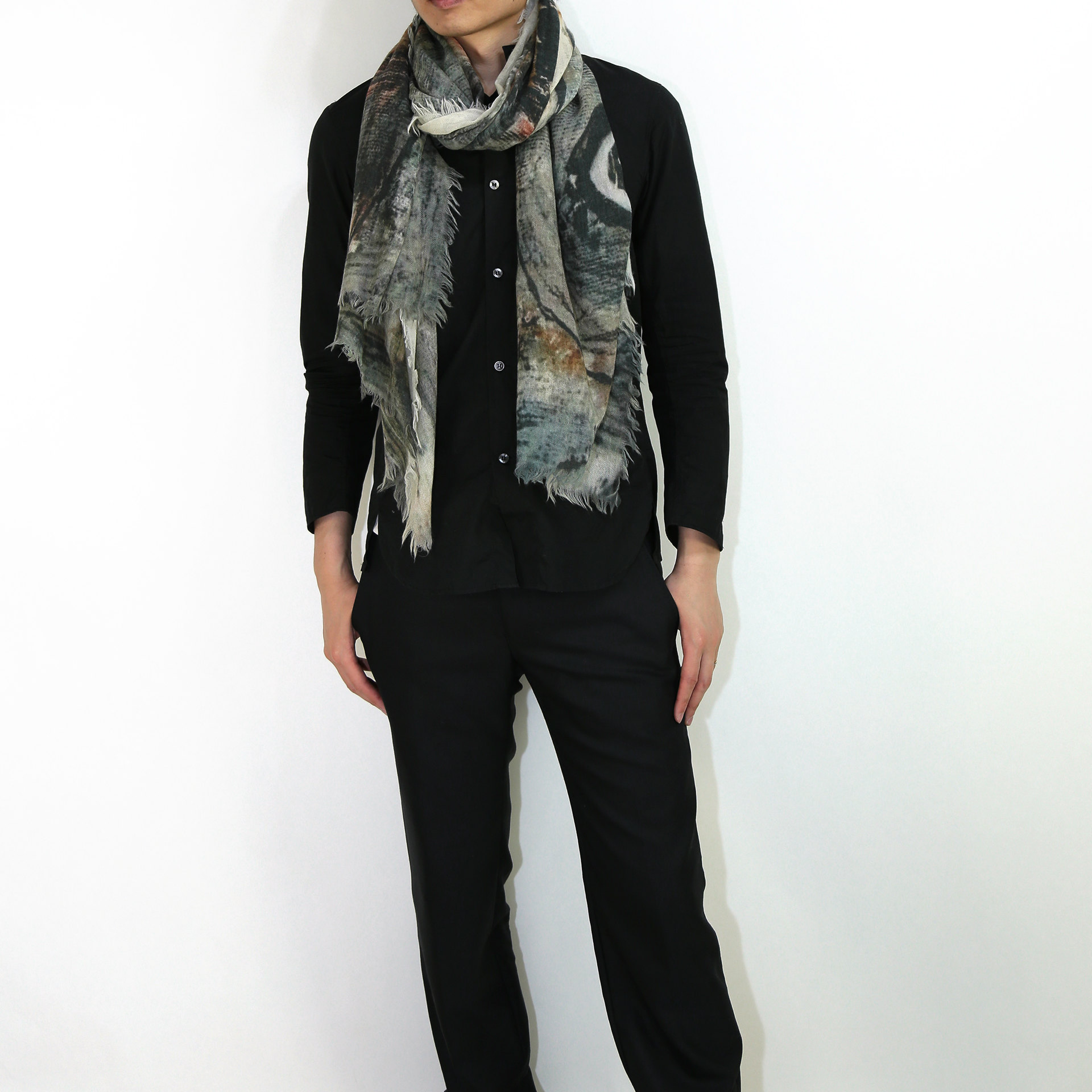 大判の長方形で、端面はナチュラルな断ち切り加工を施しています。どんな巻き方をしても表情豊かでお洒落な印象になります。また、折りたたんで使えばスッキリとシャープなシルエットになります。