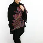 195cm×100cm大判ショールサイズで、巻きでも羽織でもどちらも使いやすいストールです。特に羽織は全面に施された刺繍が美しく輝き、サッとあしらうだけでゴージャスな雰囲気に変化します。横幅が特に長いのでドレスや着物などの羽織物としても重宝します。