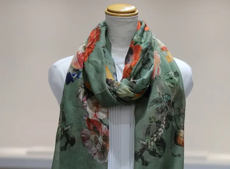 このストールは薄くて軽い生地です。使わないときは小さく折りたたみ、バッグに収納できます。外出先でも邪魔にならず、持ち運びにも便利です。
