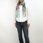 一点投入で目をみはる着映え力。建物柄が印象的なストール。薄手の素材と爽やかな色使いで季節を問わず重宝します!
