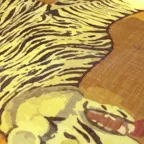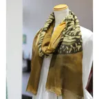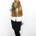 インパクトのあるモチーフが描かれたデザイン。ダイナミックな柄ですが、実際に巻くと想像以上に合わせやすい一枚です。