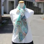 小ぶりなスクエアサイズで、アスコットタイのようにシャツやブラウスの中におさめて使うこともできます。室内でも巻いたままでいられるので使いやすくなっています。