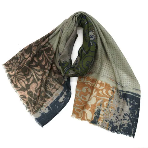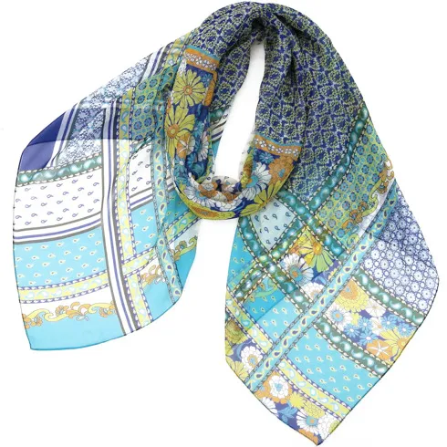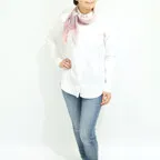 一枚でお洒落が華やかになるスカーフ。落ち着いたピンクベースの色使いで合わせやすさとアクセント効果の両方を兼ねた使いやすい一枚です。