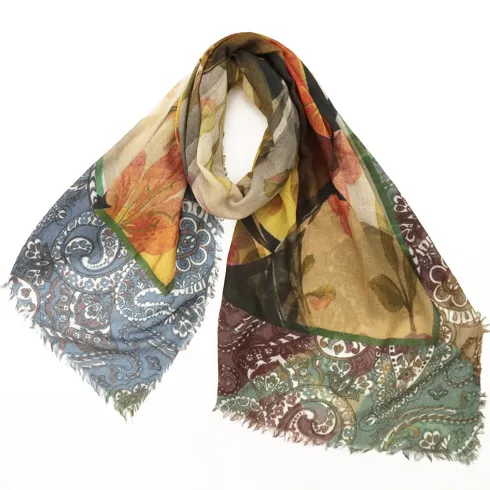 一枚でお洒落が華やかになるプリントストールの装い。でも派手な柄には抵抗あるわ・・・という方にもおすすめしたい一枚です。