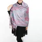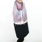 スタンダートな大判サイズで巻いても羽織っても、どちらも使いやすいタイプです。特に羽織は全体の印象がパッと華やかに、エレガントな雰囲気に変化します。