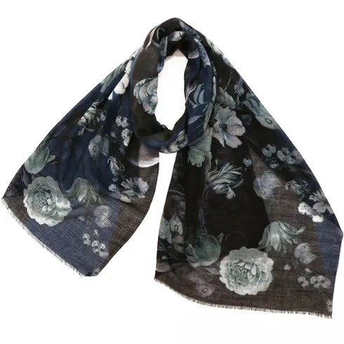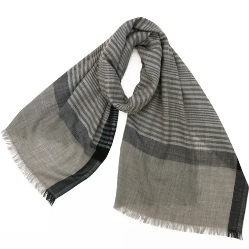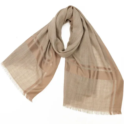 繊維が非常に細く目が詰まった生地で、するりとなめらか、たとえようのないやわらかさになっています。生地感よりカジュアルな普段使いにも、少しフォーマルなシーンでも使いやすいタイプです。スタイルや場所を問わず合わせることができる優れたストールです。