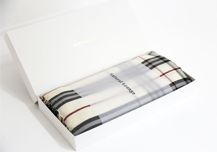 ご注⽂いただいたストール・スカーフのサイズにぴったり合ったボックスを使⽤し、半透明の上質な純⽩紙で丁寧にお包みします。